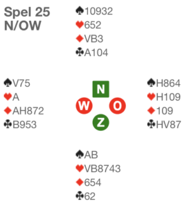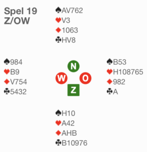 Op de meeste tafels opende zuid 1SA, paste west en bood noord 2♥️ (transfer). Een zestal oostspelers, waaronder ikzelf, durfden het – kwetsbaar tegen niet – niet aan om een doublet te geven, waarna NZ ongestoord in 3SA eindigden, dat na ♦️-start met drie overslagen werd gehaald. Aan de rest van de tafels doubleerde oost wel en toen werd het spel een stuk interessanter. Twee NZ-paren realiseerden zich dat 3SA nu gevaarlijk zou worden en legden aan in 4♠️. Dat was een prima keuze, want na ♥️B-start gingen, met de schoppens netjes 3-3, alleen ♣️A en een ♥️-slag verloren. Bijna alle andere NZ-paren trokken zich niets aan van het doublet en parkeerden in 3SA. Alle westspelers kwamen nu wel uit met ♥️B, voor ♥️V en ♥️H, die zuid moet bukken. Nu kreeg oost de kans om te bewijzen dat doublet op 2♥️ de juiste actie was. Een kleine harten zou niet goed genoeg zijn: zuid duikt ♥️A nog een keer, west komt aan slag en kan geen harten meer spelen. De leider verliest alleen nog ♣️A; 3SA+1. Oost moet dus ♥️10 naspelen om ♥️9 van partner te vangen (krokodillencoup), waarna zuid onherroepelijk (één of twee) down gaat. De zuidspelers die de tweede harten nemen in de hoop dat west ♣️A heeft wacht hetzelfde lot. Merk op dat het met noord als leider zowel 6♣️, 6♠️ als 6SA is.